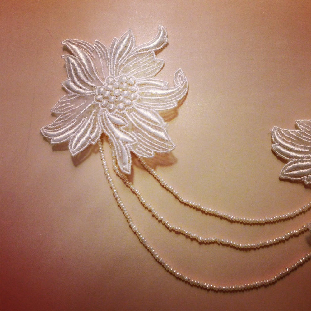 Jamie and I met a few times to look at the pieces, decide on what style she wanted, and how to make it match the dress. You can see below an "in progress" shot of the gorgeous embroidered flower from her moms dress (I later beaded the front of the flower to match the beading on her dress).