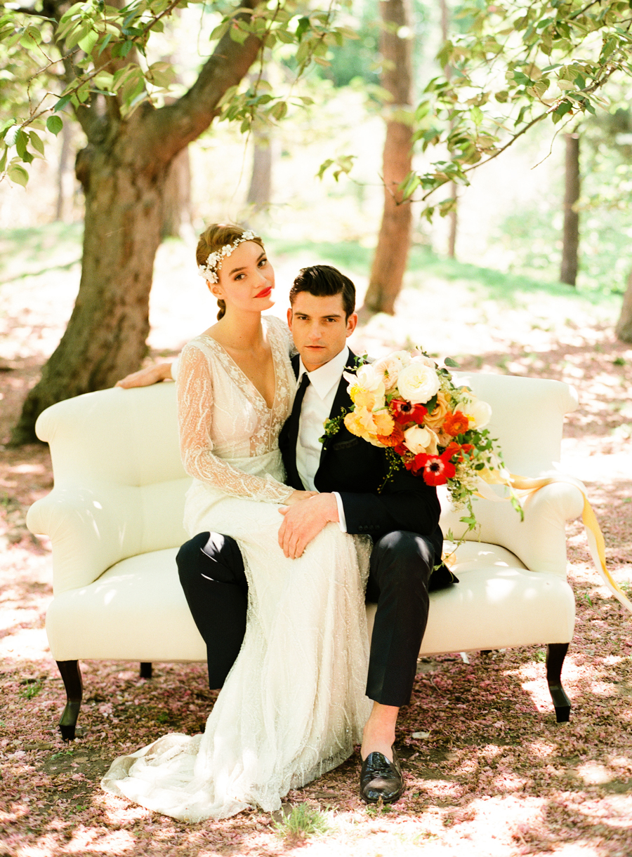 Photography: Lindsay Madden / Floral Design: Full Aperture Floral / Table Design: Henry & Co Design / Styling, Veil, & Headpiece worn during table scape shots: Hushed Commotion / Hair & Makeup: Facetime Beauty / Stationery: Leen Jean Studios / Cake: Nine Cakes / Ribbon: Silk & Willow / White Couch: Luther Quintana Upholstery / Large Plates/Charger: Frances Palmer Pottery / Hue Blush Plates: Crate and Barrel / Napkins: Julia B. Linen / Large Crystal Wine Glasses: Waterford / Gilded Rim Glassware:Anthropologie / Wood Table: Props for Today / Chairs: Lillian August / Silverware & Antique Rose Colored Glasses: Henry & Co Design / Wedding Dress: Lihi Hod from Gabriella New York / Headpiece for portraits: Hermione Harbutt / Menswear: Bloomingdales / Men’s Styling: Taylor Tyssen / Models: Melissa Cuc with Ford Models & Peter Ward of ADAM Models